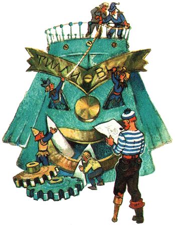 Но сделать туловище, голову и конечности великана – это была только часть дела, и притом не самая главная. Ведь Тилли-Вилли должен будет ходить и бегать, владеть оружием с мечом и щитом. Для этого следовало начинить его множеством шестерёнок, рычагов, пружин, больших и малых, которые заменят великану мускулы; это требовало большого искусства и времени. К счастью, Мигуны издавна слыли великолепными мастерами, а в последние годы у них была отличная практика по разборке и сборке Железного Дровосека с его сложными механизмами.
