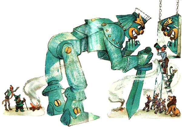 – Знаете, друзья, я ещё в Канзасе решил, что нашим помощником в борьбе с Арахной должен стать не кто иной, как мальчишка. Да, да, не удивляйтесь, именно железный мальчишка в тридцать локтей ростом. Здесь, на Изумрудном острове, собирая его металлические детали в одно целое, я внушал им, что будущий Тилли-Вилли должен обладать мальчишеской смелостью, презрением к опасностям, жаждой подвига…