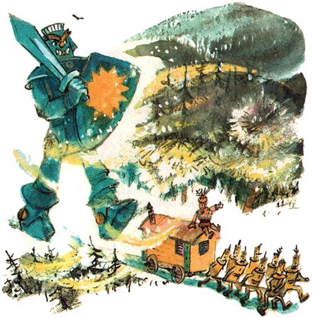 "Нет, – сказала сама себе колдунья, – мне с таким железным парнем схватываться несподручно. Но ничего, у меня есть волшебный ковёр, и пусть этот простак гоняется за мной по стране на своих двоих".