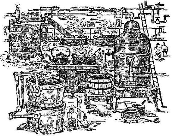 Сейчас же внутри что-то загрохотало, всю ее заволокло паром, а сама она угрожающе затряслась. И тут остолбеневшие зрители увидели, как по всем стеклянным трубкам побежала жидкость и тонкими струйками полилась в сосуд. Причем из каждой трубы лилась жидкость особого цвета, так что в сосуде играли и пенились все цвета радуги (и многие другие). Это было чрезвычайно красивое зрелище.