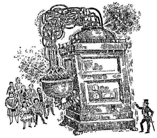 Мистер Уонка подвел всю компанию к гигантской машине, стоявшей в самом центре Цеха Изобретений. Эта гора сверкающего металла возвышалась высоко над головами детей и их родителей, а наверху из нее выходили сотни переплетенных друг с другом тонких стеклянных трубочек, которые, загибаясь книзу, гроздью свешивались над огромным круглым сосудом, размером с большую ванну.