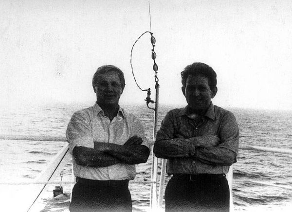 Старший механик Г. Анисимов и 2-й радист К. Корняков на теплоходе "Абагурлес"