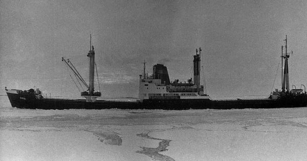 Пароход "Елец" с народнохозяйственным грузом идет во льдах в порт Дудинка