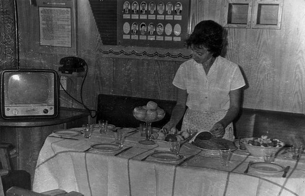 Буфетчица теплохода "Ока" накрывает праздничный стол по случаю подъема Государственного флага СССР