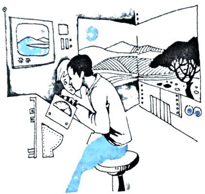 Они вошли в домик. На его стенах - небольшие пульты с приборами. И под ними - машины: насос, распылитель. Рядом - два экрана, один большой, телевизионный, другой поменьше - телевид. Возле них - что-то вроде телефона.
