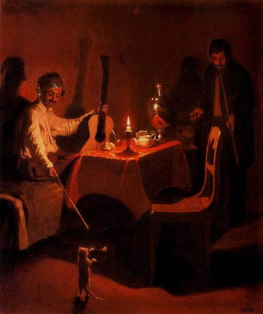 По тому же принципу построено живописное зрелище на полотне. Первому взгляду представляется нечто невнятное - колыхающееся дымно-душное марево; из него постепенно реконструируется элементарно-простейшее: свеча, стол, топчан, гитара, прислоненная к стене, лежащая фигура, тень пуделя и какое-то призрачное существо в дверном проеме в глубине слева. Люди и вещи превращены в живописные фантомы, какими они воспринимаются в зыбком промежутке между сном и явью, где кажущееся и действительное неотличимы друг от друга. Это двуликое, каверзное единство призрачного и действительного - одно из воплощений известной метафоры "жизнь есть сон".
