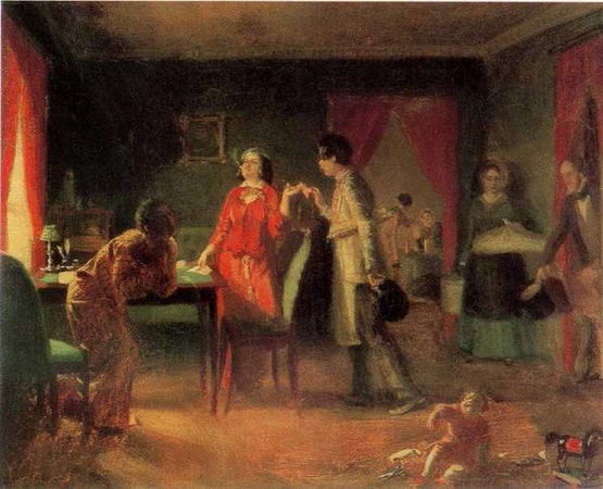 Перед нами воистину "театр абсурда": нам настоятельно предлагается обратить особенное внимание на то, что на сцене жизни нет ничего, достойного внимания. Совершенно то же провозглашает словосочетание анкор, еще анкор! Оно ведь означает повторяющееся воззвание, понукание к действию, тогда как само это действие есть не что иное, как одурь от бездействия. Это своего рода колыхающаяся пустота. Вне атрибутов аллегорической поэтики Федотовым создана аллегория на тему "суета сует" - бессобытийная пьеса со всеобъемлющей, всемирной темой. Поэтому, кстати, бессмысленная смесь "французского с нижегородским", фраза ничейного наречия, "Часов однообразный бой - / Томительная ночи повесть! / Язык для всех равно чужой / И внятный каждому, как совесть!" (Тютчев) - эта бессмыслица все же имеет смысл, и он в том, что в пространствах русской, равно как и французской скуки "часов однообразный бой" раздается и время утекает одинаково. .