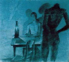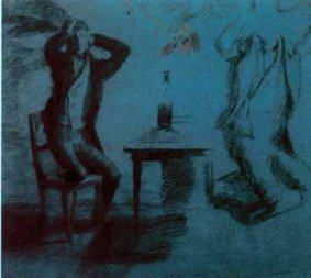 Быть может, в силу природной абстрактности графического языка (сравнительно с более чувственно конкретной живописью) в рисунках к Игрокам, выполненных лихорадочным, горячечным штрихом на бумаге холодного синего тона, соотнесенность таких вот двойственных состояний с миром запредельным, ирреальным выражена с более впечатляющей, чем в живописном полотне, пронзительной отчетливостью.