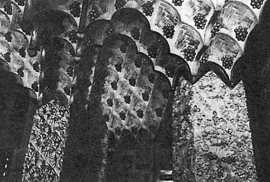 Во-вторых, это использование диагональных линий, лежащих в основе арок и "сталактитов". И в-третьих, это напоминающие легкое кружево кованые решетки и выполняющие роль ковров картины, выложенные из керамической плитки с включениями, сделанными из дикого камня.