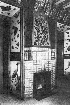 Подобное сочетание несочетаемого можно также разглядеть и в решении интерьера дома. Наиболее ярким примером этого является оформление столовой в доме Висенс. Общему затемненному фону комнаты, выдержанной в строгом стиле, словно противопоставлена светлая стена со встроенным в нее камином, украшенным светлыми и яркими изразцами, изображающими растения и птиц.