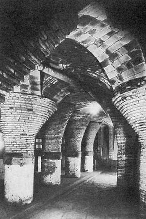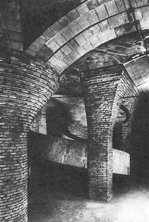 Грибообразные колонны, поддерживающие своды подвального помещения дворца Гуэль