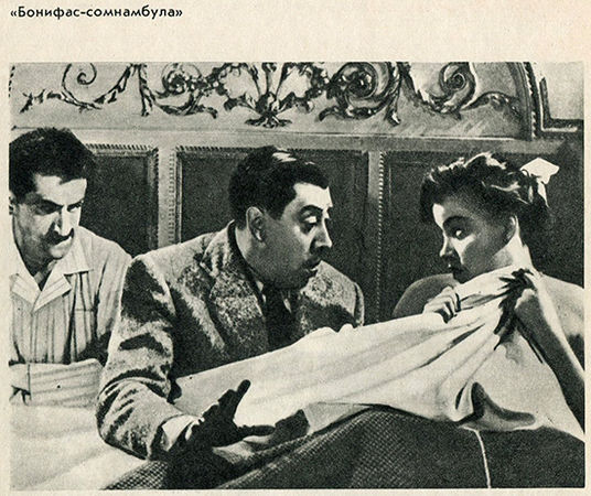 В самом деле, только-только свалился он с помоста, украшенного цветами, влекомого недоспавшими фавнами. Казалось бы, побереги голову, подуй на воду. Ан нет! Он торопится снова взгромоздиться на такой же помост, увенчать свою куцую прическу трогательным веночком из флердоранжа, принять парад именитых граждан провинциального городка, торжественную процессию пожарной команды, растроганную речь мэра. И снова принимает позу, отставляет худую ножку, всхлипывает от радости, машинально обрывает лепестки на белой шляпке. Но помост трогается с места, и замечтавшийся Фернандель, как прежде, шлепается на руки. Правда, есть здесь одно отличие: дело происходит не в театре, а в действительности. Есть и еще одно: историю эту сочинил не Франсис Карко, как было у Дженнины, а Ги де Мопассан, и называется картина не "Парижское развлечение", а "Избранник мадам Юссон".