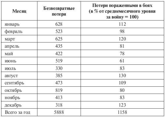 Наиболее надежными нам представляются данные о безвозвратных потерях за ноябрь, когда Красная Армия почти не понесла потерь пленными, а линия фронта была стабильна вплоть до 19-го числа, когда советские войска перешли в контрнаступление под Сталинградом. Поэтому можно считать, что потери убитыми учтены в этом месяце полнее, чем в предшествовавшие и последующие, когда быстрое перемещение фронта и штабов затрудняло учет, и что безвозвратные потери в ноябре приходятся почти исключительно на убитых, поскольку советские войска почти не несли потерь пленными. Тогда на 413 тыс. убитых и умерших будет приходиться показатель в 83 % пораженных в боях, т. е. на 1 % среднемесячного числа пораженных в боях приходится приблизительно 5,0 тыс. убитых и умерших от ран. Если же принять за базовые показатели января, февраля, марта или апреля, то там соотношение, после исключения примерного числа пленных, будет еще большим – от 5,1 до 5,5 тыс. погибших на 1 % от среднемесячного числа пораженных в боях. Декабрьские же показатели явно страдают большим недоучетом безвозвратных потерь из-за быстрого перемещения линии фронта.