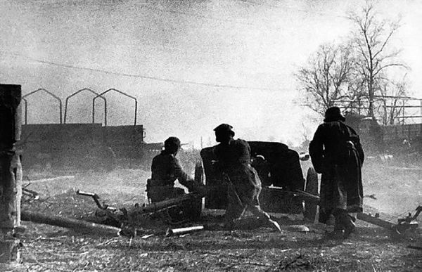 Немецкая противотанковая пушка ведет огонь по советским танкам