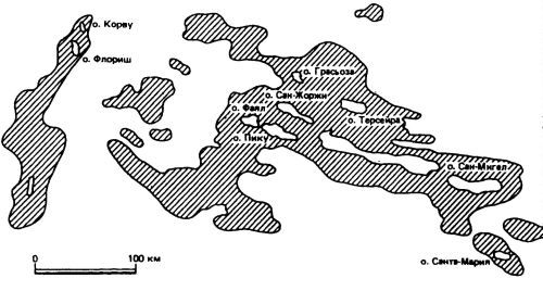 Карта Азорских островов. Азорское подводное плато заштриховано. По 3. Кукалу.