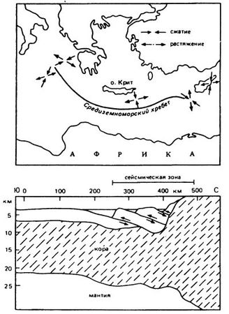 Вверху: расположение подводного хребта. Стрелки показывают напряжение земной коры. Внизу: гипотетическая реконструкция тектонической структуры. Согласно этой схеме, происходит движение африканской плиты под европейскую и распад ее на блоки.