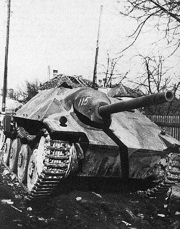 САУ Hetzer, подбитая в ходе боев в Будапеште. Февраль 1945 года. Номер 115 нанесен советской трофейной командой