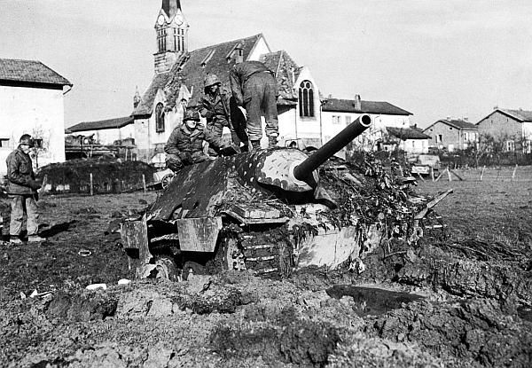 Американские солдаты осматривают Hetzer, подбитый на севере Франции. Ноябрь 1944 года