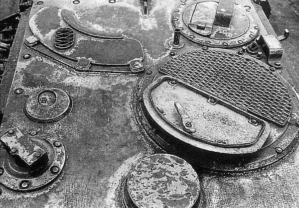 Крыша рубки "Ягдтигра". Вверху справа – командирская башенка с лючком для стереотрубы, перед ней – посадочный люк командира, вверху слева – дугообразная амбразура перископического прицела