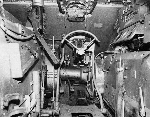 Рабочее место механика-водителя. Хорошо видны штурвал, панель приборов (справа над коробкой передач) и прибор наблюдения механика-водителя. Слева – рычаг и сервомеханизм открывания крышки посадочного люка механика-водителя