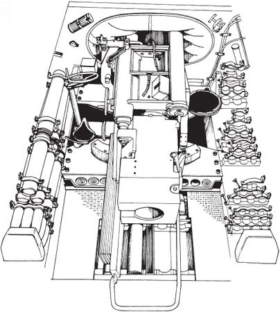 Боевое отделение САУ "Ягдтигр". На переднем плане – казенная часть 128-мм пушки. Слева от нее – рабочее место наводчика и маховик горизонтальной наводки. Над ним, в крыше рубки, установлено так называемое "устройство ближнего боя" – казнозарядная мортирка для стрельбы дымовыми и осколочными гранатами. По бортам рубки – стеллажи для пеналов с зарядами