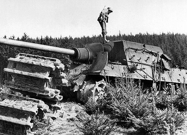 "Ягдтигр" с ходовой частью Порше (шасси №305001) из состава 653-го батальона тяжелых истребителей танков, ставший жертвой американской авиации. На втором плане виден еще один подбитый "Ягдтигр"