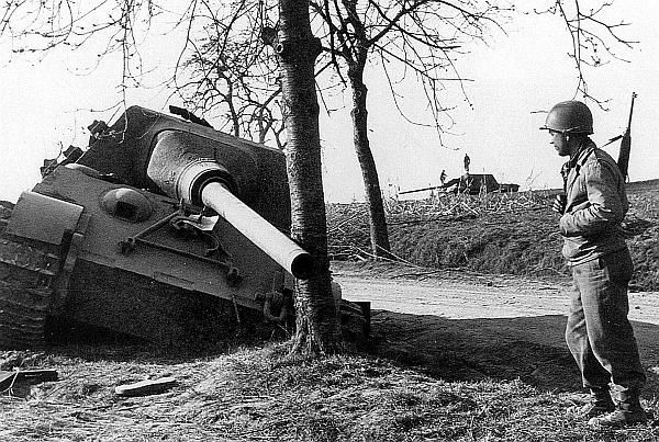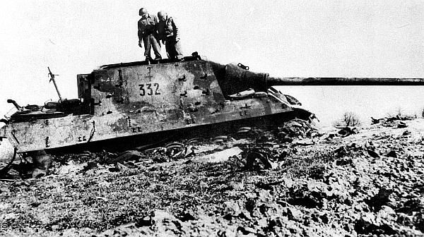 Следует, правда, отметить, что достигнутая с таким трудом штатная численность 653-го батальона была условной, так как часть его машин была разбросана на достаточно большой территории от Витлиха до Бонна. Все они находились в неисправном состоянии, эвакуировались или готовились к эвакуации. Некоторые ремонтировались на месте и вступали в бой. Так, например, два "ягдтигра" поддерживали пехоту 14-го корпуса СС близ Ауэнхайма. В этом бою, кстати, они успешно обстреляли контратакующие "шерманы" фугасными снарядами. В январе 1945 года был безвозвратно потерян первый "Ягдтигр".