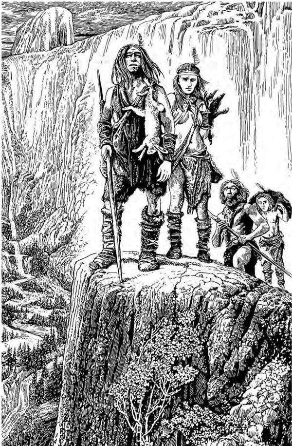 После долгой и утомительной ходьбы они очутились во влажной низине озера, окаймлённого широким кольцом зелёных кустов ивняка, и здесь присели отдохнуть. Вдруг Улла толкнул Волчью Ноздрю и показал пальцем в сторону. В отдалении они заметили другие «бугры», которые на их глазах шевелились, переходили с места на место.