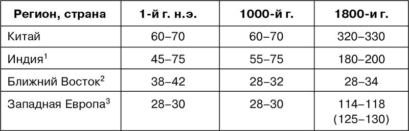 Первое тысячелетие нашей эры отмечено многими событиями, среди которых: гибель империй, переселения народов, массовые пандемии, вызвавшие в дальнейшем стагнацию (Китай, Индия, Западная Европа), а в некоторых регионах мира (Ближний Восток) снижение общей численности населения (см. табл. 1).