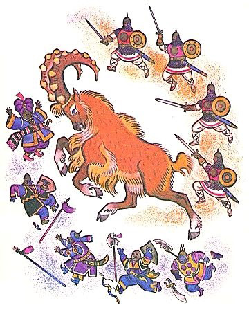 На помощь стражникам бросилось царское войско. А луки не стреляют. Копья не колют. Лошади испугались тура, поднялись на дыбы. Подпруги у сёдел лопнули. И всадники попадали. Тут все стали просить пощады. Богатырь пощадил всех.