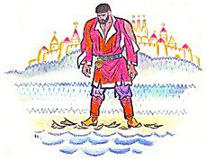 Не послушался Добрыня. Поехал. Долго он ехал чистым полем. Не один день, не одну ночь. Когда белые богатырские кости видел, останавливал коня, снимал шлем, склонял голову. Наконец доехал до Почайны-реки. Река как река, одни берег низкий, другой берег крутой. Водяные струн текут, не торопятся.