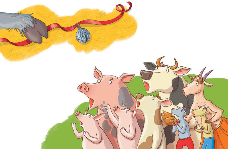 Кот отвязал с шеи бубенчик и протянул козлу. Хлев потрясённо ахнул. Бубенчики считались вершиной роскоши и ужасно ценились. Даже колокольчик, который Хозяин иногда вешал на шею коровы, не вызывал у животных такой зависти. А тут большой серебристый шарик с бархатной красной ленточкой! Старый козёл проворно прикрыл подарок копытом и проблеял: