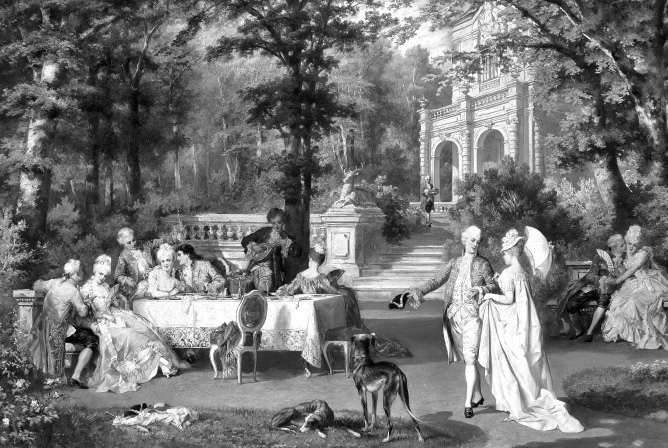 Стол, выставленный на лужайке возле Чайного домика, – небольшого, но красивого здания с четырьмя коринфскими колонами, – ломился от всевозможных яств, преимущественно русской кухни: здесь можно было увидеть исполинскую белугу и цельных осетров на огромных золотых подносах; молочных поросят и наисвежайшие окорока; чёрную и красную икру в глубоких чашах; горы фруктов и сладких лакомств в высоких, искусно сделанных вазах из горного хрусталя, – и многое, многое, многое другое. В золотые и хрустальные графины были налиты водка разных сортов и всяческие настойки; помимо этого, стояли бутылки с французскими, итальянскими и немецкими винами.