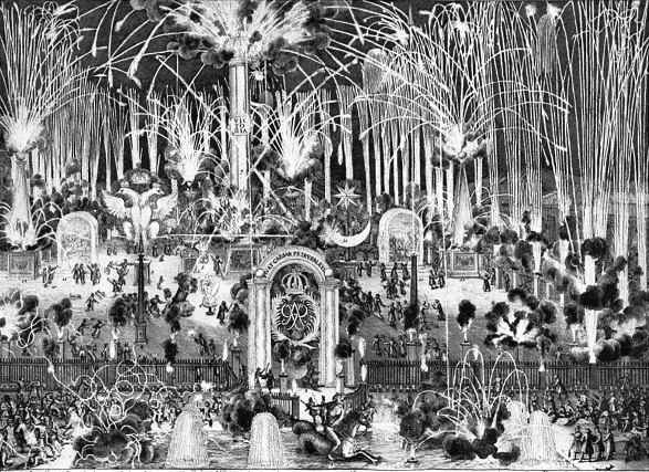 Господский дом со всеми строениями, равно и прекрасный сад с деревьями, иллюминирован был удивительно. В разных местах представлялись огненные фонтаны, как будто изливающие вверх блестящее золото. Прибытие гостей возвещено было пушечной пальбой и фейерверком, чудесным образом составившим в небе надписи «А.О.» и «70».