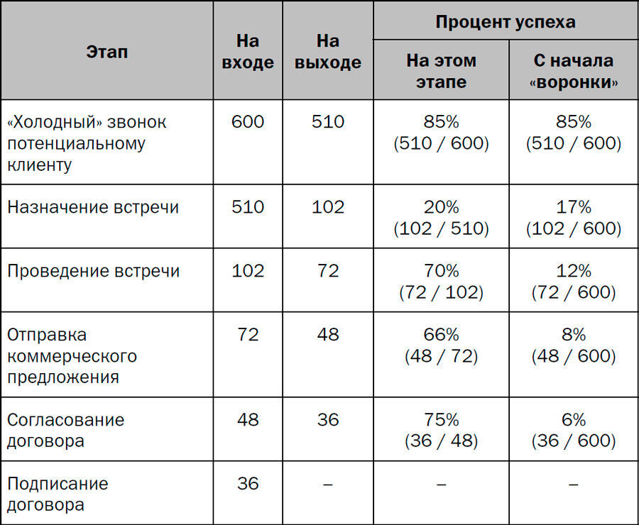 Цифра в четвертом столбце означает процент клиентов, успешно прошедших именно через этот этап (на профессиональном языке это называется «процент конверсии» или просто «конверсия»). Цифра в пятом столбце процент клиентов, добравшихся от начала «воронки» до конца этого этапа.
