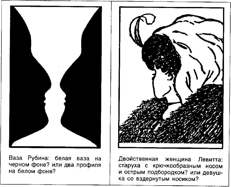Всё это говорит о том, что даже наше зрительное восприятие не есть некоторой процесс, осуществляемыйобъективно, независимо от нашего внутреннего мира, а строится при помощи механизмовсубъективных, основанных на нашем прежнем опыте. В некоторых случаях нехватки зрительной информации образ-гипотеза попросту достраивается нашей психикой. И этот процесс мы можем особенно ярко наблюдать при таких явлениях, как восприятие неоднозначного образа, получившим название "фигура-фон" когда из разнородного стимульного материала мы можем извлечь сразу два или больше образов одновременно. Наиболее известны из подобных изображений это "ваза два лица" или "молодая девушка старуха". Или же "Фрейд обнажённая женщина".
