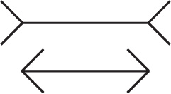 Я не видел ни одного издания, в том числе Канемана, где бы правильно преподносился весь глубокий смысл иллюзии Мюллера Лайера. Посмотрите ниже: вы видите на ней две абсолютно ровные и одинаковые линии. Я сейчас настаиваю на том, чтобы вы не переворачивали страницу, взяли линейку и измерили эти две линии. Я хочу, чтобы с помощью линейки вы убедились, что линии одинаковые.