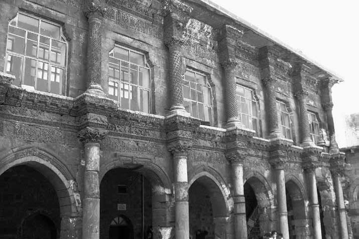 Как уже было сказано, двор диярбакырской мечети обстроен зданиями, – справа от входа расположено артукидское медресе Месудие, слева – обновленный Османами молитвенный зал шафиитского мазхаба. Торцы двора оформлены двухэтажными фасадами, названными Кресвеллом «наиболее замечательной частью мечети».[89] Согласно куфическим надписям, западный фасад датируется 1117–1125 гг., восточный – 1163 г., но, несмотря на разницу во времени, нижняя часть обоих фасадов представляет собой аркаду из 9 пролетов, опирающуюся на античные колонны-сполии, не соответствующие описанию Насира Хосрова, поскольку их фусты не являются монолитными, а набраны из отдельных мраморных барабанов. Коринфские капители колонн увенчаны высокими импостами, на них лежит раскрепованный антаблемент из того же черного камня, из которого сложены все постройки мечети. На втором ярусе фасада установлены коринфские же колонны с фустами из местного камня, покрытыми глубокой резьбой, содержащей, в частности, растительные мотивы (виноградные листья), кресты и свастики, – возможно, эти сполии происходят именно из ранней церкви; во всяком случае, Кресвелл видел параллели декорации фасадов в памятниках VII–IX вв.[90]