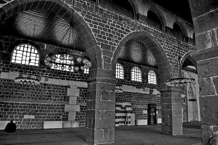 Общим в мечетях Дамаска и Диярбакыра является не только план с тремя поперечными нефами и повышенным трансептом. Объединяет оба памятника и использование аркад в интерьере – правда, античные колонны с коринфскими капителями, поддерживающие аркады в Дамаске, в Анатолии уступили место квадратным в сечении каменным столбам; куда делись сосчитанные Насиром Хосровом «двести с лишком колонн из камня»? Впрочем, и отмеченных им каменных сводов, на которых «снова возвышаются колонны, покороче первых», в мечети Диярбакыра уже нет: если в дамасском памятнике нефы действительно разделены двойной аркадой на колоннах с коринфскими капителями и импостами, то в сельджукской постройке аркады на столбах несут стены с облегчающими арочными проемами, подчеркивающие поперечное нефное членение интерьера.