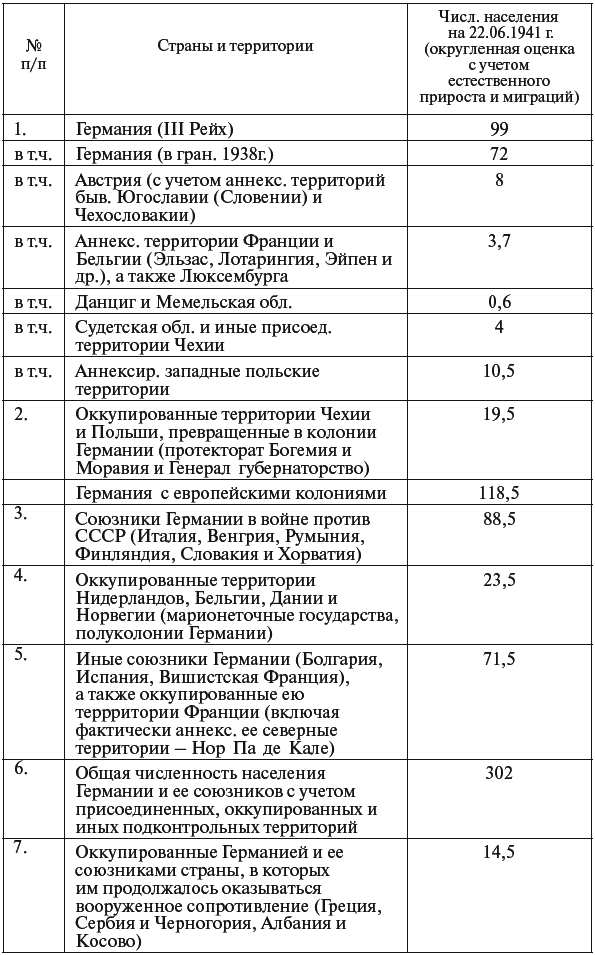 Численность населения Германии, ее союзников в войне против СССР, а также подконтрольных им стран и территорий можно представить в виде таблицы (с. 61).