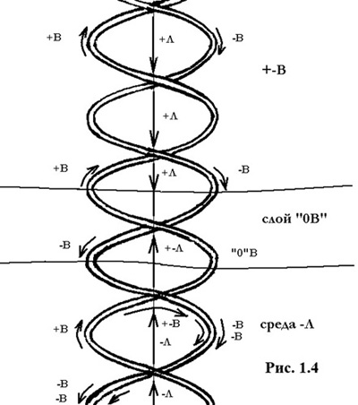 Ранее мы уже упоминали о существовании несущих энергий, по которым текут энергии «плюс» и «минус» «В», на них также возникают «энергетические пробки» – «нуль В». Несущие нейтральны, их нельзя охарактеризовать знаками «плюс» и «минус», по ним «текут» энергии «В» разных знаков, но в то же время они не могут течь одновременно по одному и тому же участку (см. рис. 1.4). Несущая энергия «В» внешне похожа на двойную спираль, напоминающую спираль ДНК.