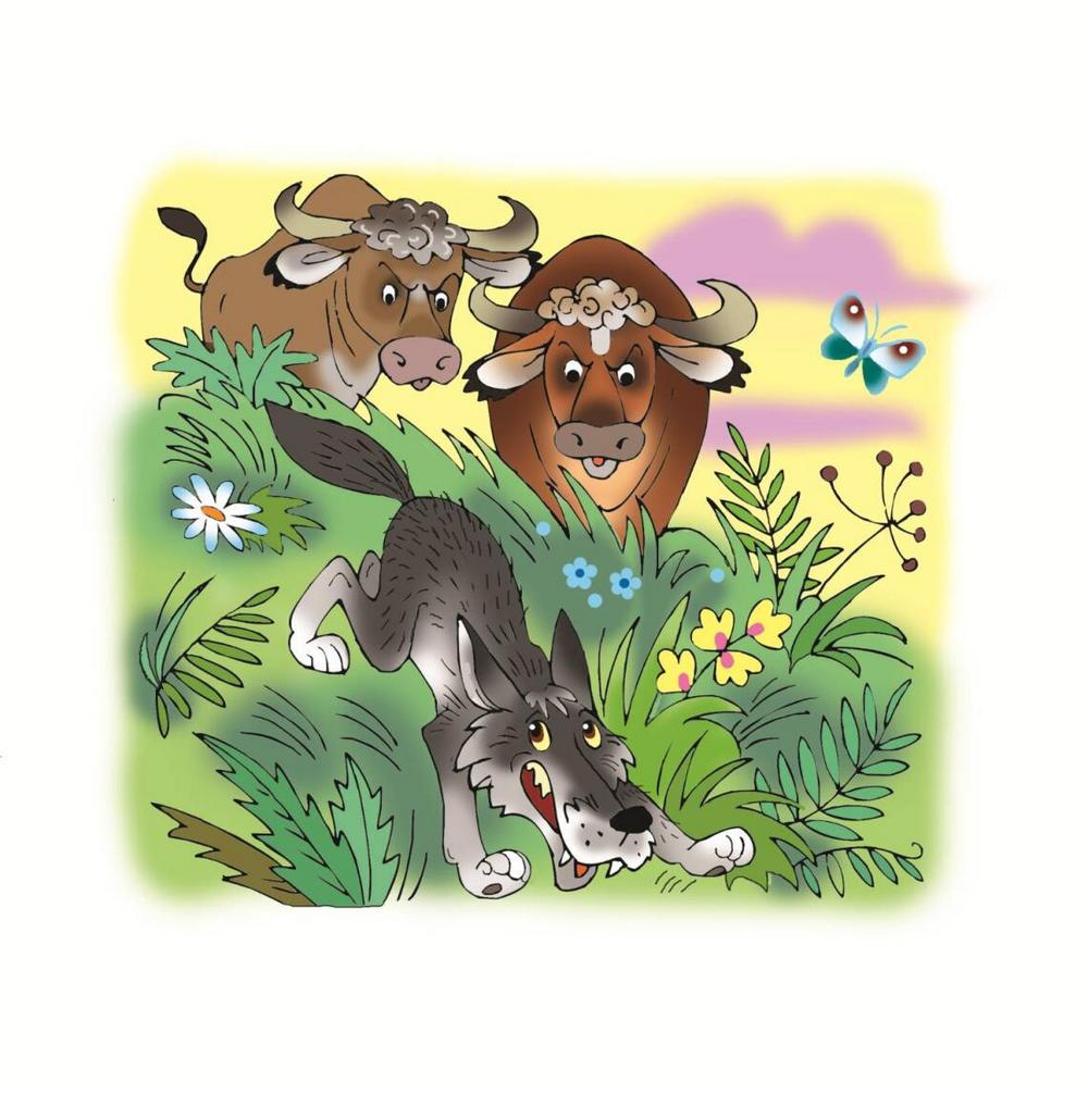 Напал Волк на Корову да не успел за-грызть. Прибежали старые Быки, намяли ему бока, и пришлось Медведю спасаться.