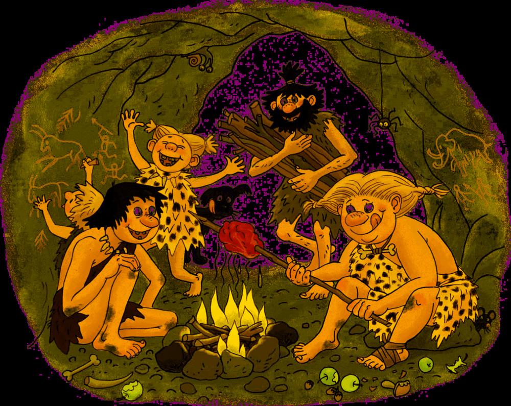 Если бы мы могли сесть в машину времени, отправиться в прошлое и заглянуть на обед к первобытному человеку, то увидели бы, что наши предки питались примерно одинаково. Они ещё не умели возделывать поля, поэтому охотились и собирали съедобные растения, которые встречались у них на пути, например орехи и дикие яблоки. А готовили эту нехитрую снедь на костре.