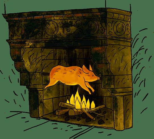 В средневеко́вых за́мках Германии строили огромные камины, в которые можно было поместить целого кабана и пожарить его на ве́ртеле.