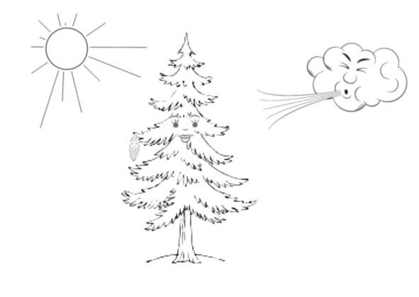 Елочка с шишечкой дружили и вместе играли с ветерком. Ветерочек раскачивал ветви и прятал шишечку. Им было весело.