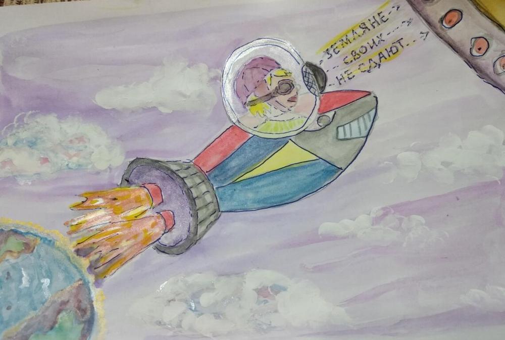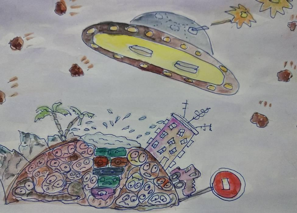 Даник поймал котлету руками, засунул её в рот и, прожёвывая на ходу, убежал в гараж. Он завёл свою суперракету и полетел в космос. Он подлетел к инопланетянам и крикнул им: