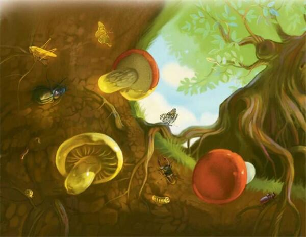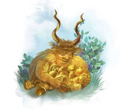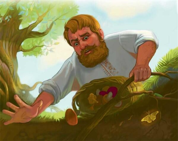 Глядь, а недалеко от корзины, под корнями дерева, яма вырыта. Да большая какая, целый бык может в ней поместиться! Кто же ее вырыл? Любопытно стало мельнику, решил он в яму заглянуть, нагнулся да по неосторожности задел свою корзину. Грибы раз и в яму покатились. Всего-то несколько грибков упало, да Евстигней такой жадный был, что и за одним бы полез.
