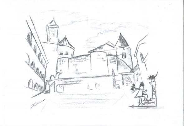 Малыш- Черныш так испугался, что забрался под самую высокую крышу и спрятался в самом тёмном углу самого старого замка очень древнего города.