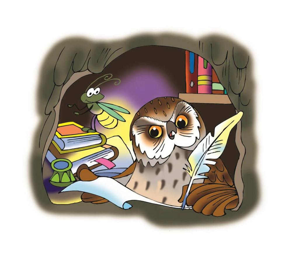 Сидит учёная Сова в своём домике и сочиняет. А рядышком верный и надёжный друг Светлячок освещает уютное помещение.