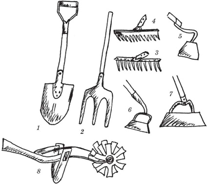 Для выполнения работ на участке необходимо обзавестись несложными орудиями труда (рис. 1). Важно, чтобы инвентарь был исправен, с хорошо подогнанными черенками и рукоятками.